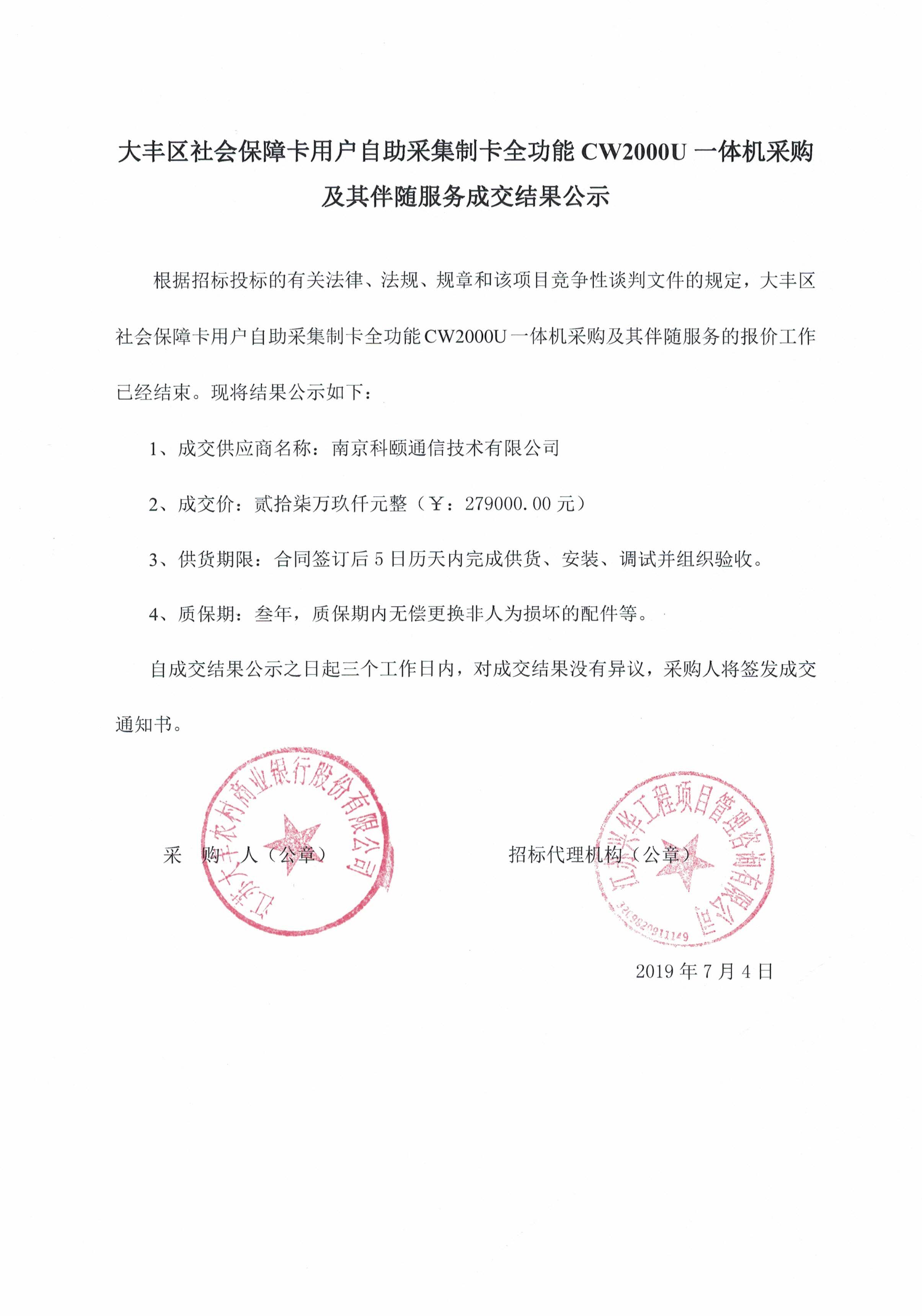 大丰区社会保障卡用户自助采集制卡全功能CW2000U一体机采购及其伴随服务项目成交结果公示